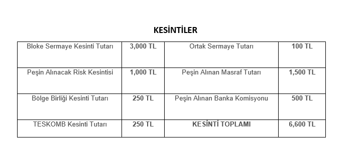 • 100,000 TL  kredi içinde peşin olarak %6 oranında komisyon alınmaktadır. Bu oranın %3’ü sermaye olarak bloke edilmektedir. Bloke edilen 3,000 TL’lik kısım kredi kapanması ile birlikte son taksitten düşülerek iade edilmektedir.